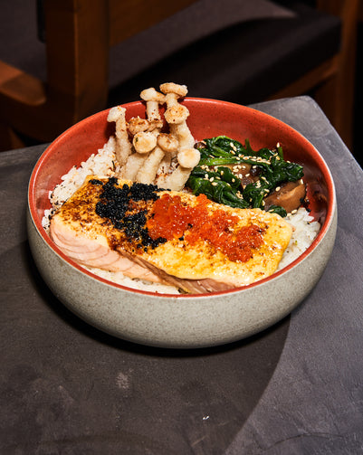 Lightly torched Salmon, miso, ebiko, ikura. Served with a side of shimeji mushrooms and spinach.