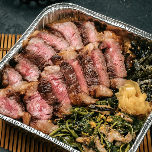 Premium Japanese Wagyu Sirloin. House-made Gari. Wasabi Salt. Wagyu Steak Sasanishiki Chahan. The tray is good for 3-4 pax.